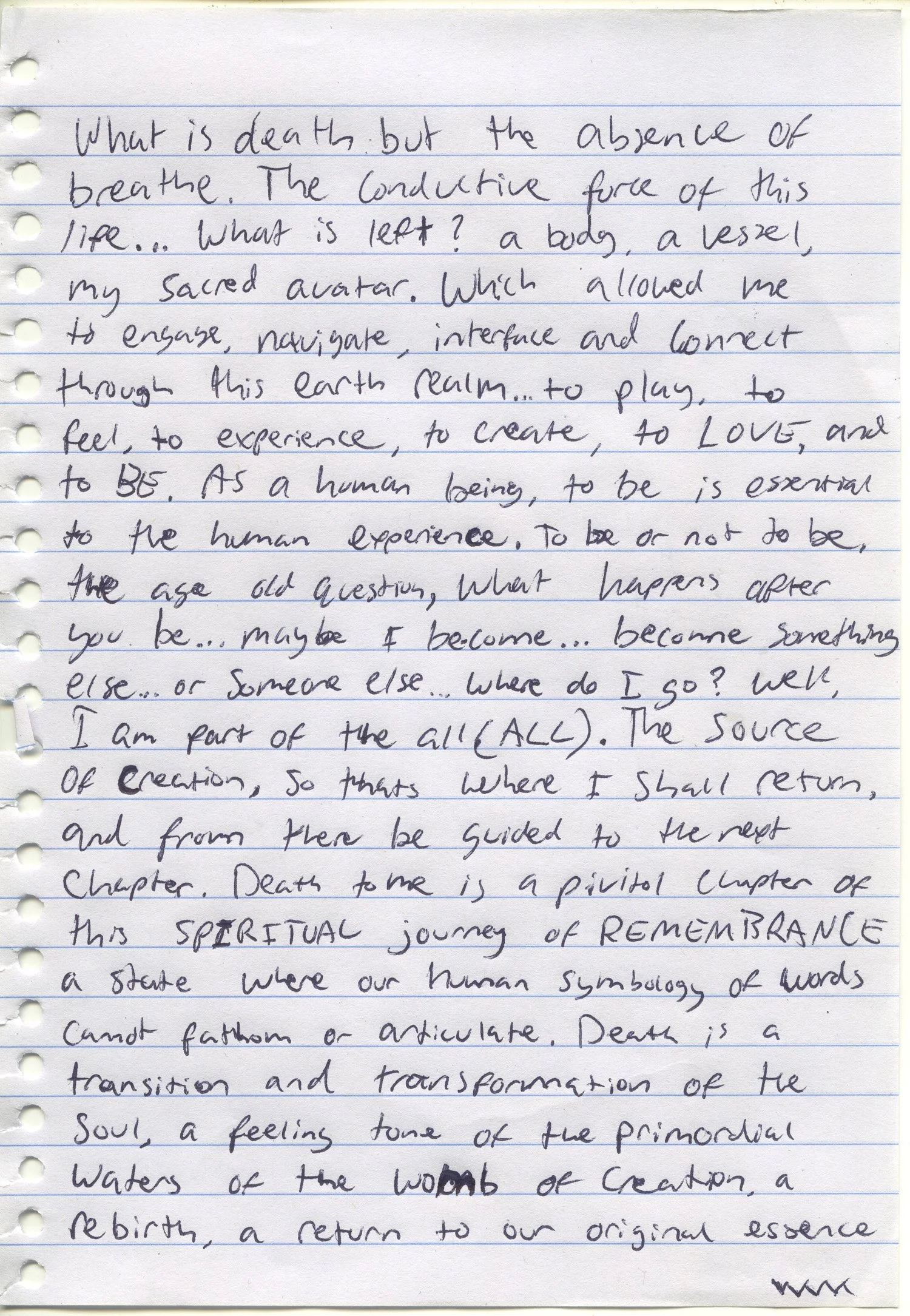What is death but the absence of breath. The conductive force of this life...What is left? A body...a vessel, my sacred avatar. Which allowed me to engage, navigate, interface and connect through this earth realm....to feel, to play, to experience, to create, to love...and to BE.