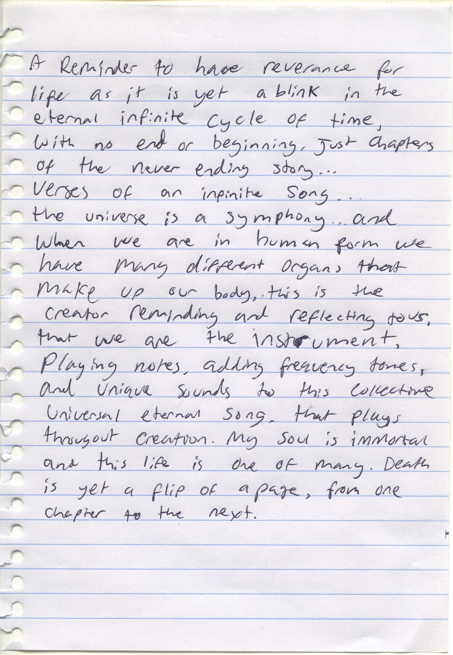 A reminder to have reverence for life as it is yet a blink in the eternal infinite cycle of time, with no end or beginning. Just chapters of the never ending story…..verses of an infinite song….the universe is a symphony…and when we are in human form we have many different organs, that make up our body…this is the creator reminding and reflecting to us, that we are the instrument. Playing notes, adding frequency tones, and unique sounds to this collective universal eternal song, that plays throughout creation. My soul is immortal and this life is one of many. Death is yet a flip of a page, from one chapter to the next.