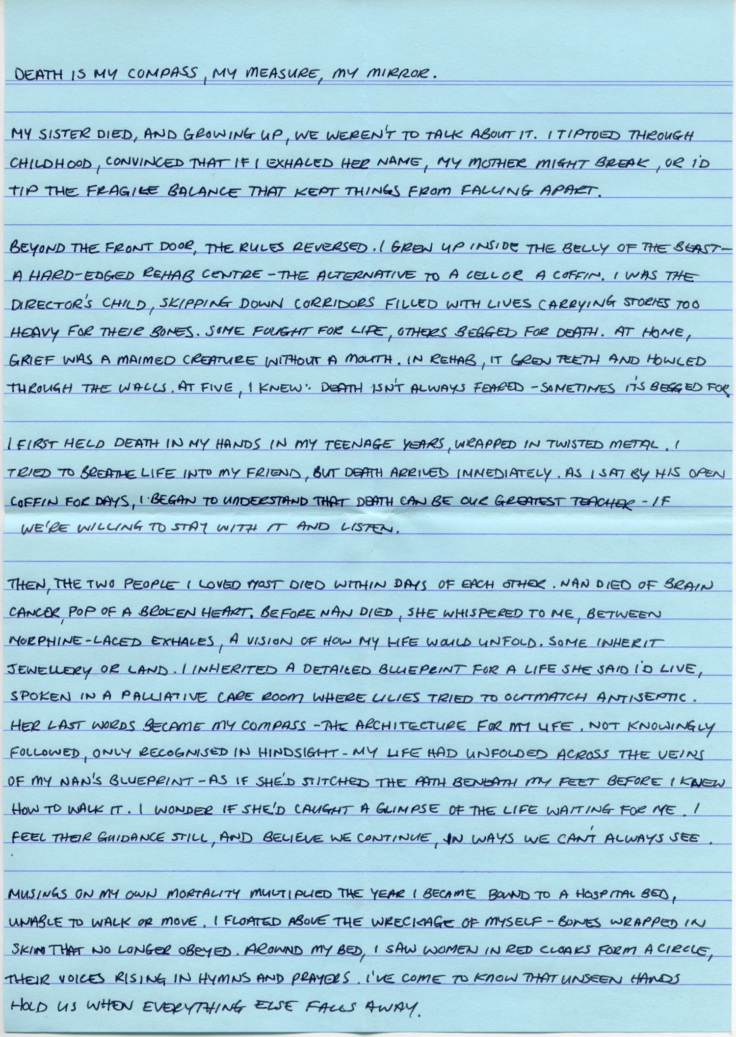 Then, the two people I loved most died within days of each other: Nan died of brain cancer, Pop of a broken heart. Before Nan died, she whispered to me, between morphine-laced exhales, a vision of how my life would unfold. Some inherit jewellery or land. I inherited a detailed blueprint for a life she said I’d live, spoken in a palliative care room where lilies tried to outmatch antiseptic. Her last words became my compass—the architecture for my life. Not knowingly followed, only recognised in hindsight—my life had unfolded across the veins of my Nan’s blueprint — as if she’d stitched the path beneath my feet before I knew how to walk it. I wonder if she’d caught a glimpse of the life waiting for me. I feel their guidance still, and believe that we continue, in ways we can’t always see.