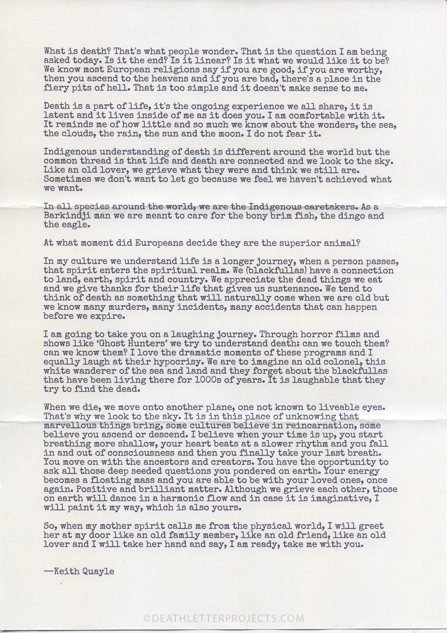 Indigenous understanding of death is different around the world but the common thread is that life and death are connected and we look to the sky. Like an old lover, we grieve what they were and think we still are. Sometimes we don't want to let go because we feel we haven't achieved what we want. In all species around the world, we are the Indigenous caretakers. As a Barkindji man we are meant to care for the bony brim fish, the dingo and the eagle. At what moment did Europeans decide they are the superior animal?
