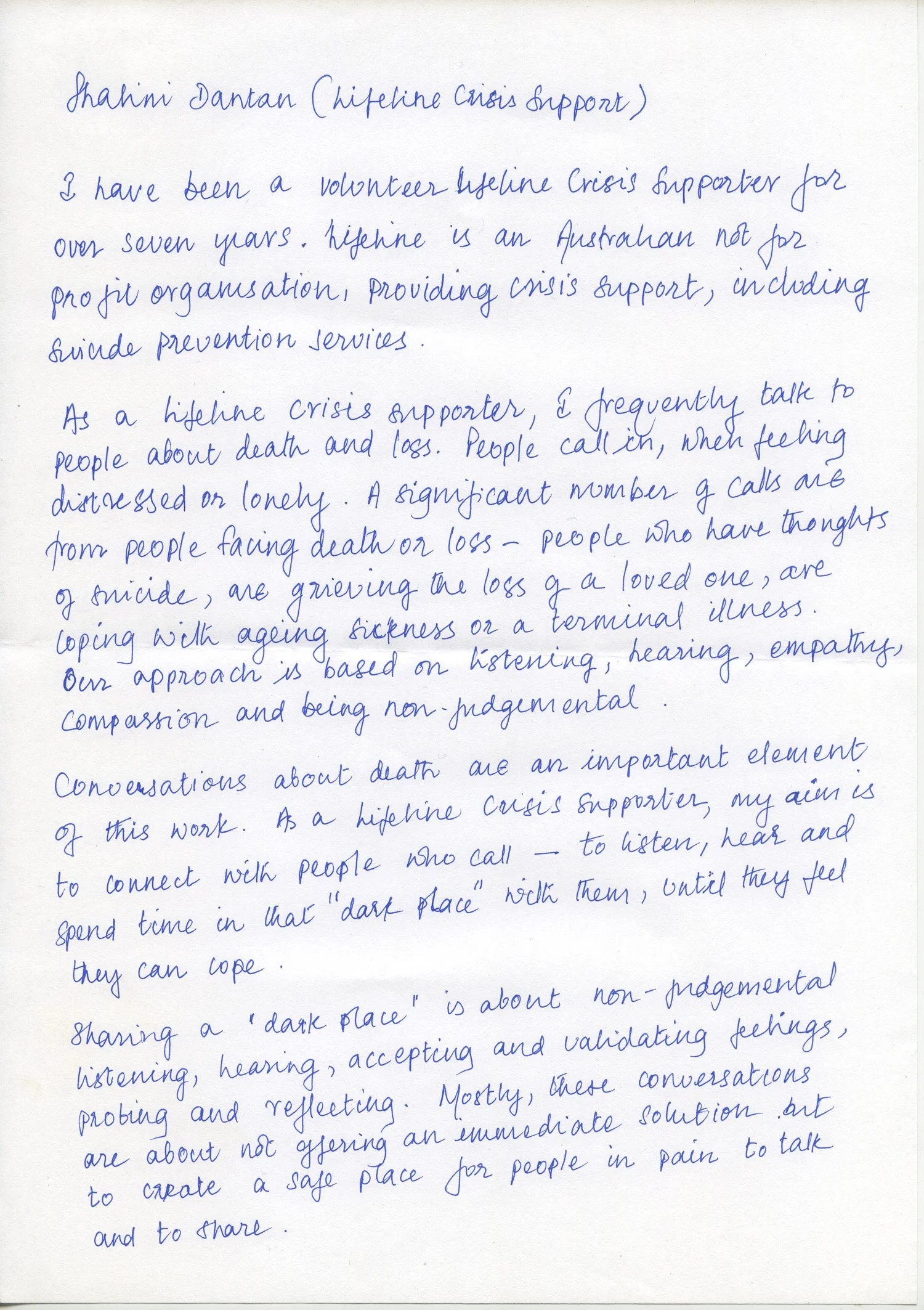 As a Lifeline crisis support counsellor, I frequently talk to people about death and loss. People call in when distressed or feeling lonely. A significant number of calls are from people facing death or loss—people who have thoughts of suicide, are grieving the loss of a loved one, are coping with ageing, sickness or a terminal illness. Our approach is based on listening, hearing, empathy, compassion and being non-judgemental.