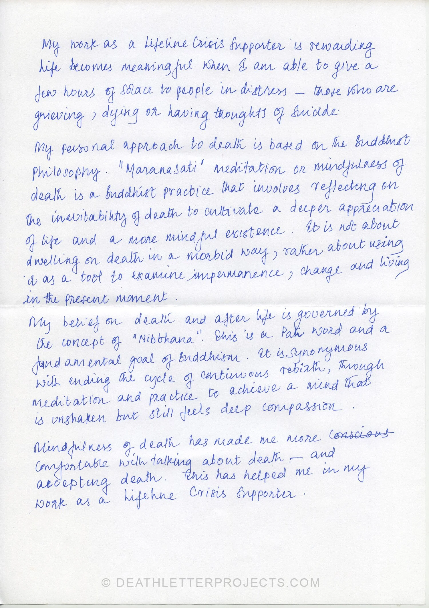 Mindfulness of death has made me more comfortable talking about death—and accepting death. This has helped me in my work as a Lifeline Crisis Supporter.