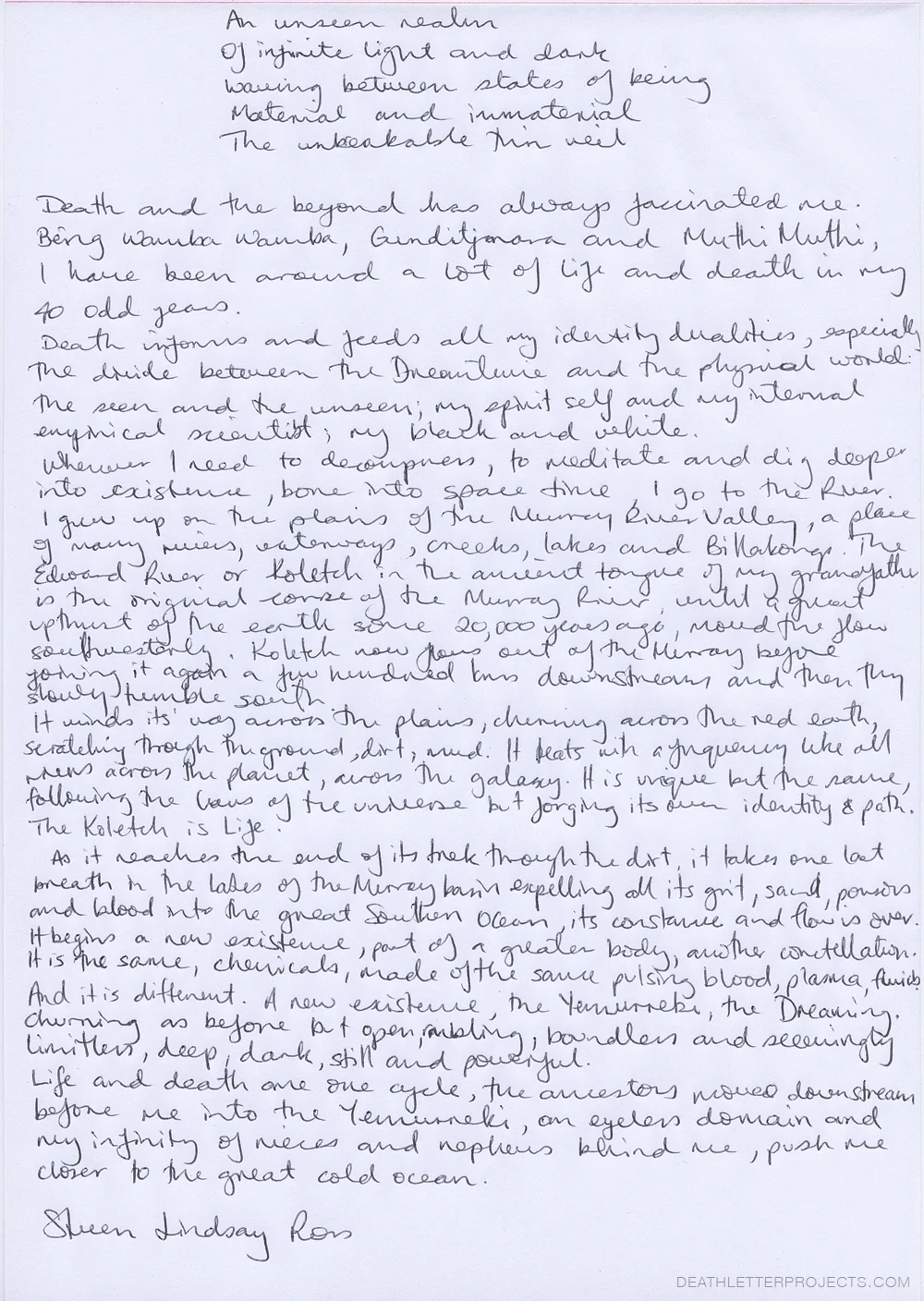 Death and the beyond has always fascinated me. Being Wamba Wamba, Gunditjmara and Mutthi Mutthi I have been around a lot of life and death in my 40 odd years.